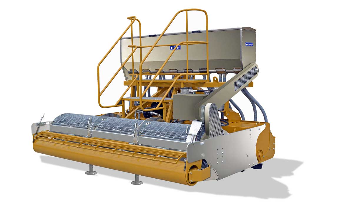 El sistema hidráulico autónomo alimenta el motor hidráulico (11) que mueve el rodillo de alisado (12), ajustable según el tipo de suelo.